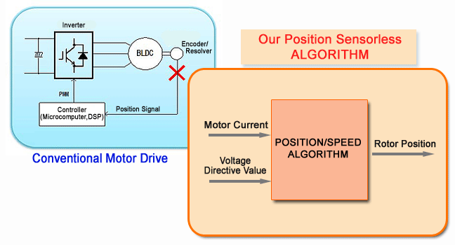The sinusoidal PMSM based brushless motor drive typically requires rotor position detection. Encoders and/or resolvers are commonly used, which attribute to higher cost, low reliability (acoustic noise) Under certain conditions, like at high temperature, or at high speed rotation they may not be applicable. We have developed a Motor Control Algorithm (software) which calculates position and speed from motor current and voltage. It is utilised in compressor drive systems for air conditioning and other industrial applications.