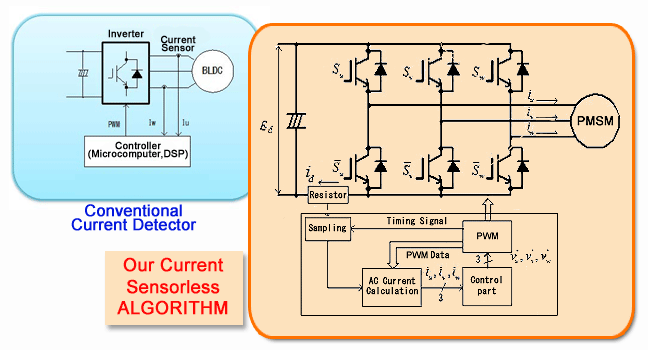 We developed current sensorless algorithm suitable for calculating AC currents from sampled DC-bus current data in the one-shunt system for over current protection. Our software technology and PWM technique make it possible to realize current detection method.